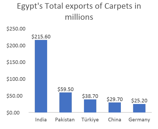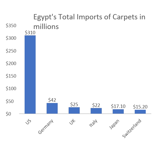 Top import of Carpets and other textile floor coverings for 2023 are the United States ($310M), Germany ($42M), the United Kingdom ($25M), Italy ($22M), Japan ($17.1M), and Switzerland ($15.2M).ย