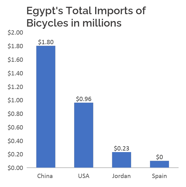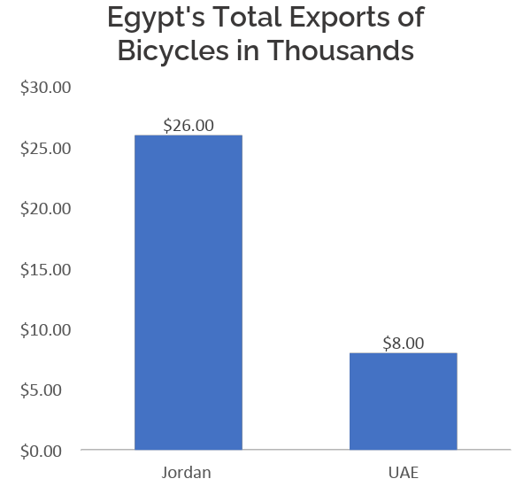 Despite strong potential, the electric bike market in Egypt faces certain limitations, particularly in exports. In 2023, Egypt imported $1.97 million worth of electric bikes and motorcycles, primarily from China ($1.8M), followed by smaller volumes from the USA ($96k), Jordan($23k), and Spain($10k). Exports, however, were minimal at just $35,000, with only two countriesโJordan($26K) and the UAE($8K)โon the receiving end.